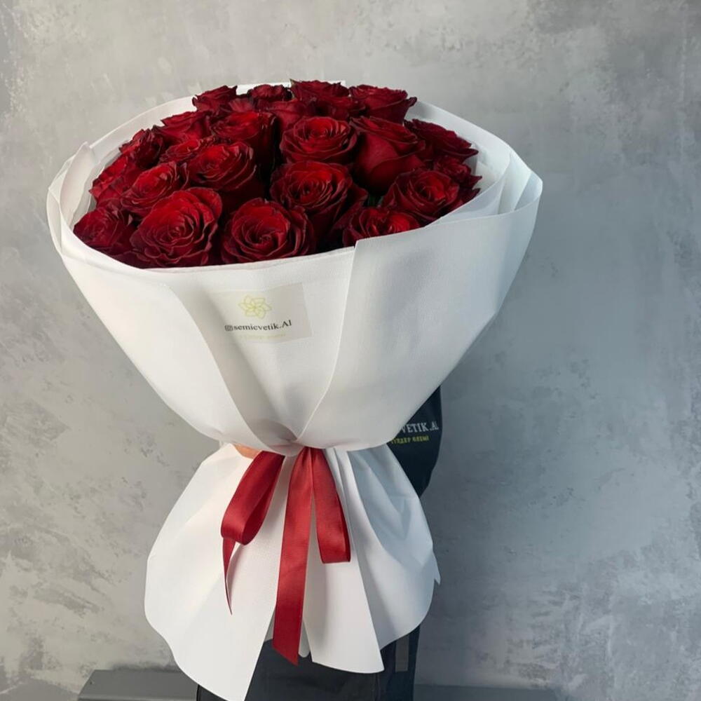 Қызыл раушан - 25 дана ақ фоамиран - 4 дана ақ тишью қағазы - 4 дана қызыл репс лента - 1 дана