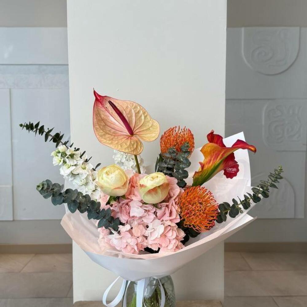 Антуриум - 1 дана Гортензия - 1 дана Калла - 1 дана Маттиола - 2 дана Эвкалипт - 1 дана Нутан - 2 дана Пионовидная роза - 2 дана