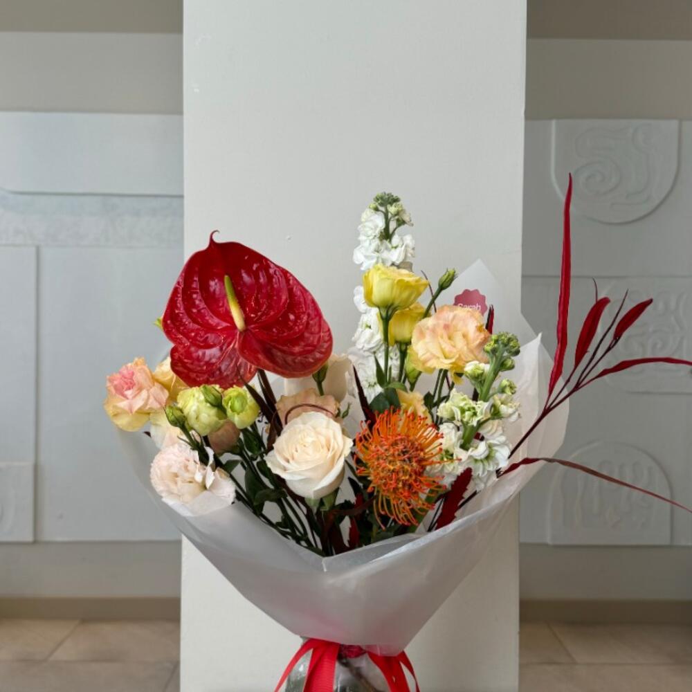 Антуриум - 1 дана Маттиола - 2 дана Раушан - 2 дана Эустома - 2 дана Нутан - 1 дана Гревиллея - 1 дана