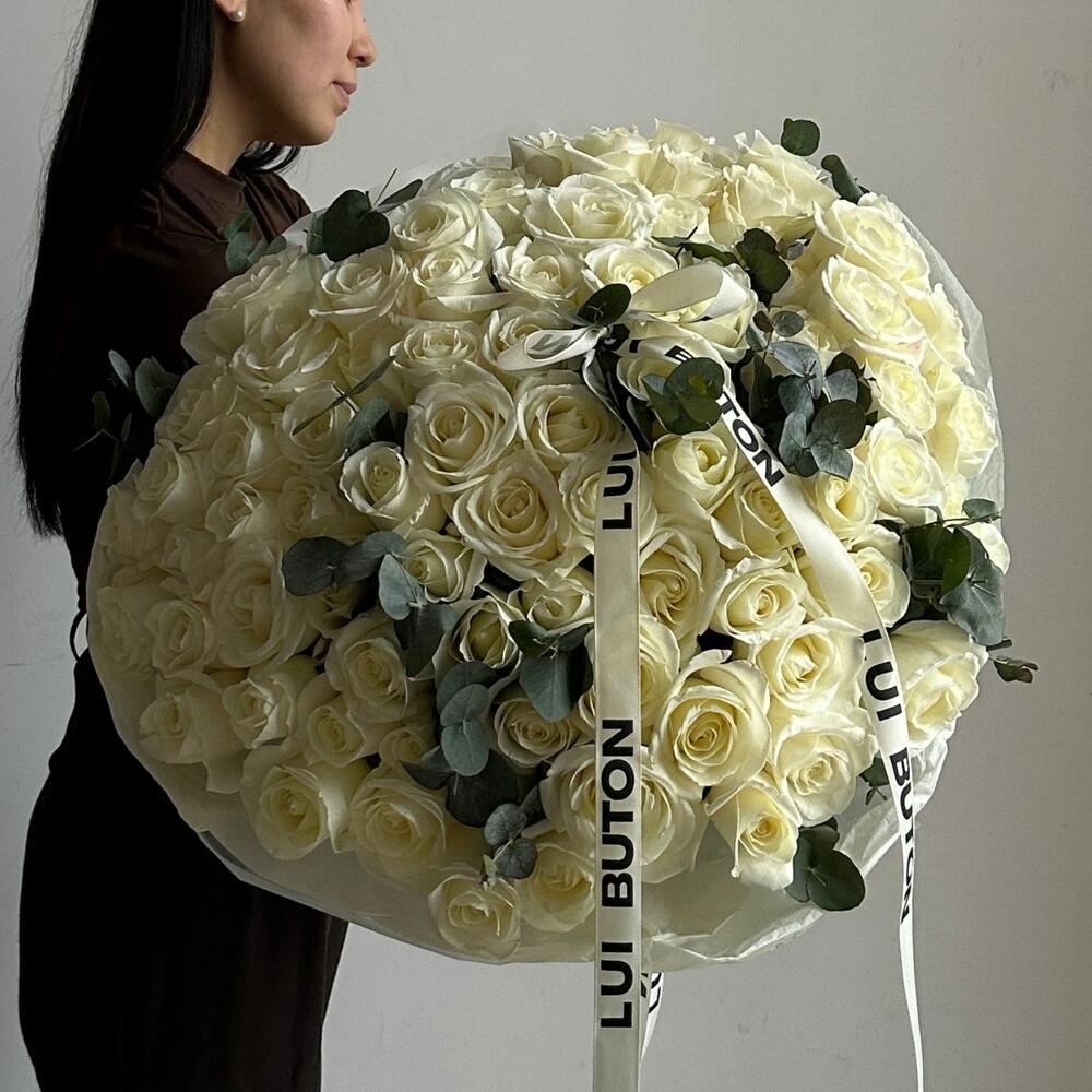 Букет "85 белых роз с эвкалиптом"