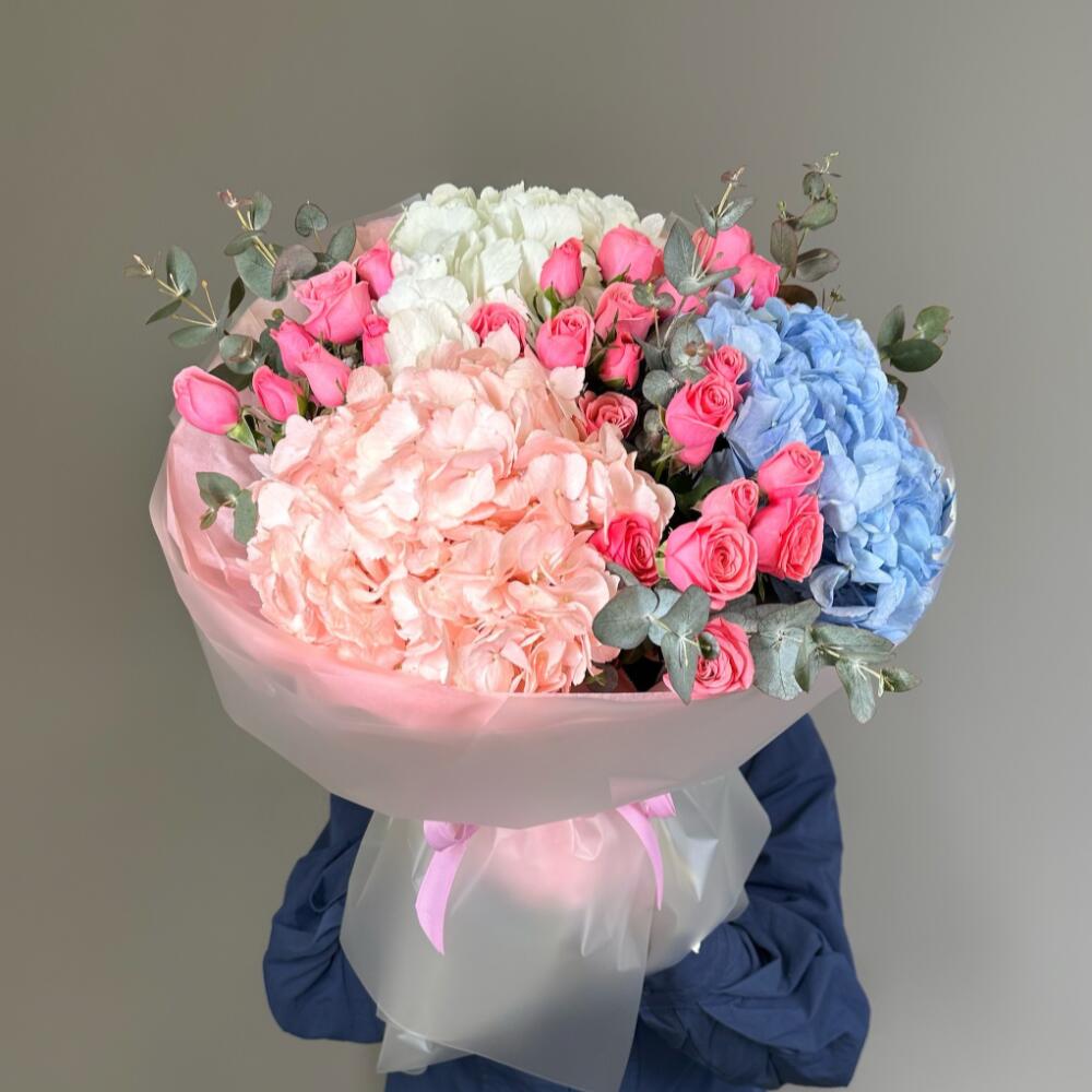 Гортензия - 3 дана Эвкалипт - 1 дана аква бумага - 1 дана кустовая спрей роза - 3 дана