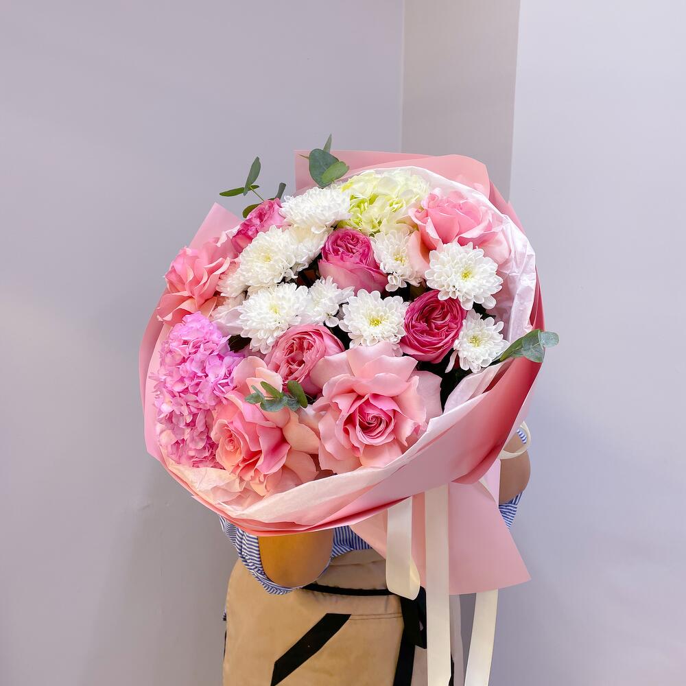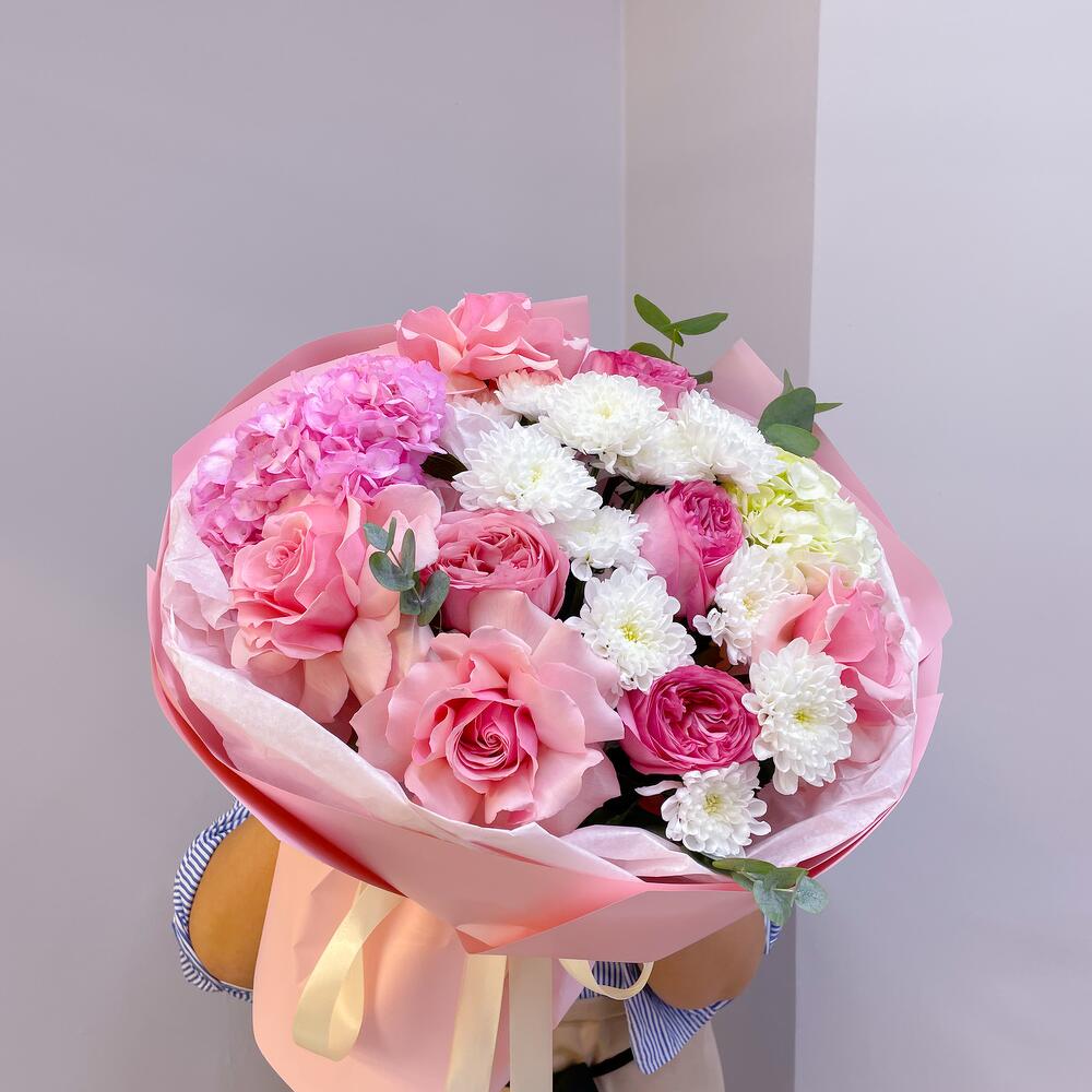 Гортензия - 2 дана Эвкалипт - 1 дана Хризантема - 3 дана Пионовидная роза - 4 дана Голландиялық раушан - 4 дана