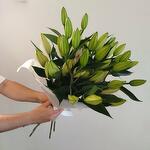 Свежие бутоны белых лилий в стильной упаковке — утончённый букет с ненавязчивым ароматом и элегантным настроением.