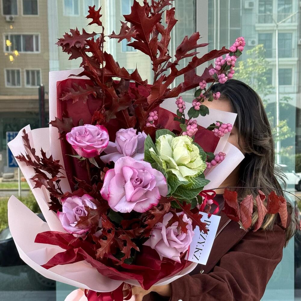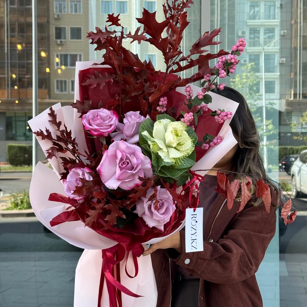 Роза Голландская - 5 дана Брассика - 1 дана Симфорикарпус - 1 дана листья клена крашенные - 2 дана листья бука стабилизированные - 1 дана