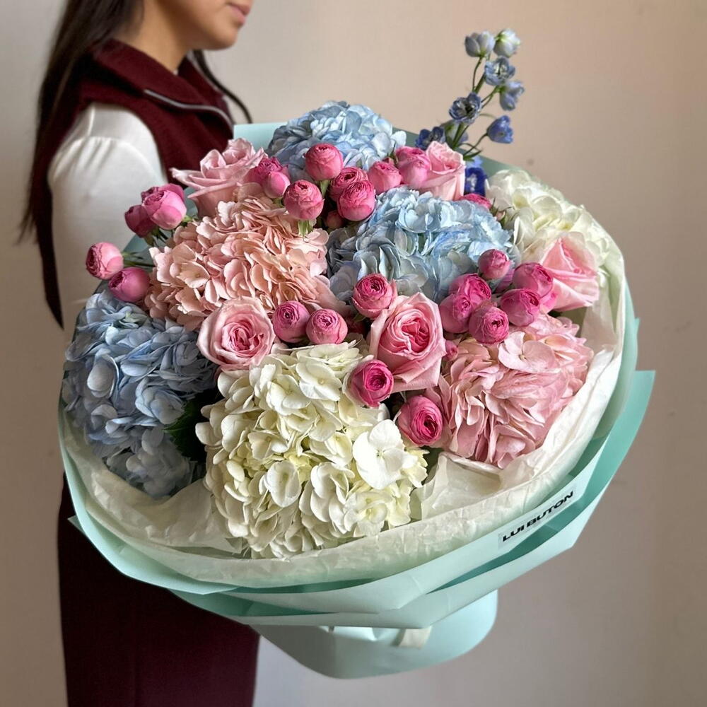 Букет из пионовидных роз, гортензий, дельфиниума и кустовых роз. Легкий, как весеннее утро, и роскошный, как праздник — этот букет станет тем самым акцентом, который не забудется