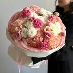 Нежный букет из гортензий, эустом, хризантем и диантусов подчеркнёт романтику момента. Он подойдёт для свидания, дня рождения или просто без повода