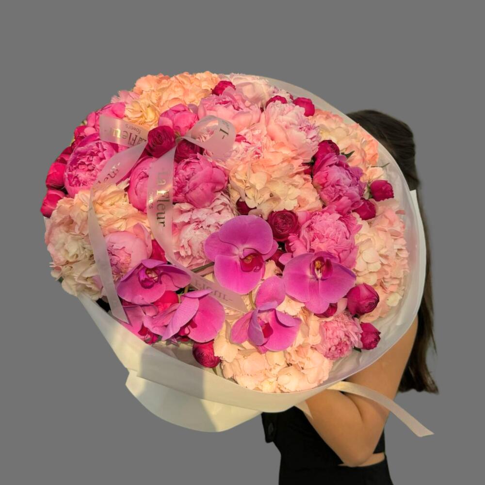 Композиция, которая производит впечатление: объёмный и роскошный букет для тех, кто хочет по-настоящему удивить. Гортензия, пионы, орхидеи и пионовидные розы — сочетание красоты и силы.