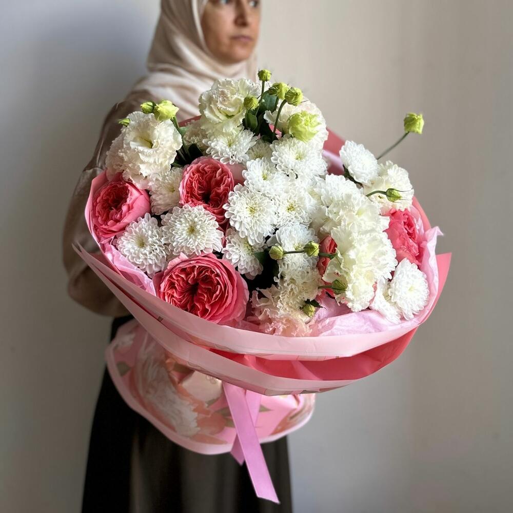 Букет из пионовидных роз, эустом и хризантем. Современный и лёгкий — для любого настроения