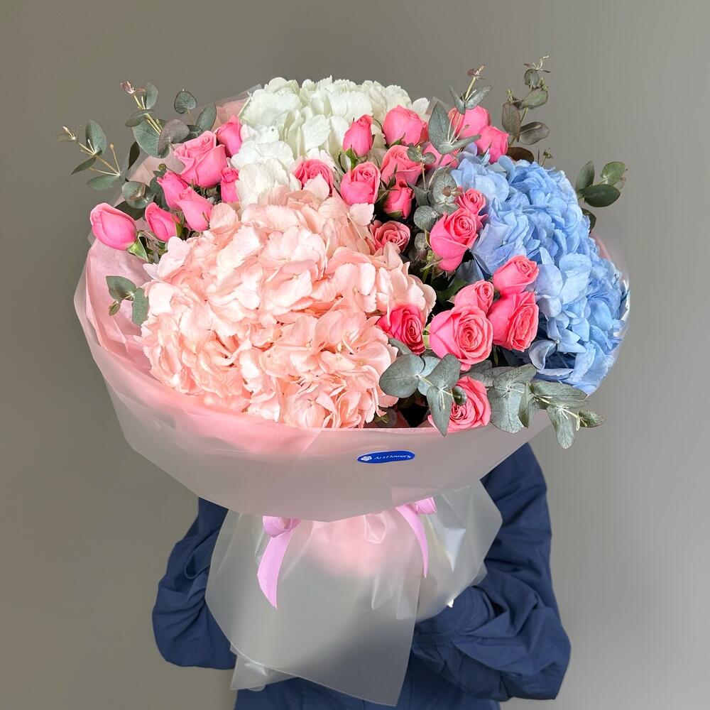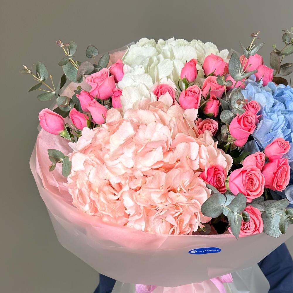 Гортензия - 3 дана Эвкалипт - 1 дана Бұта раушаны - 7 дана аква бумага - 1 дана