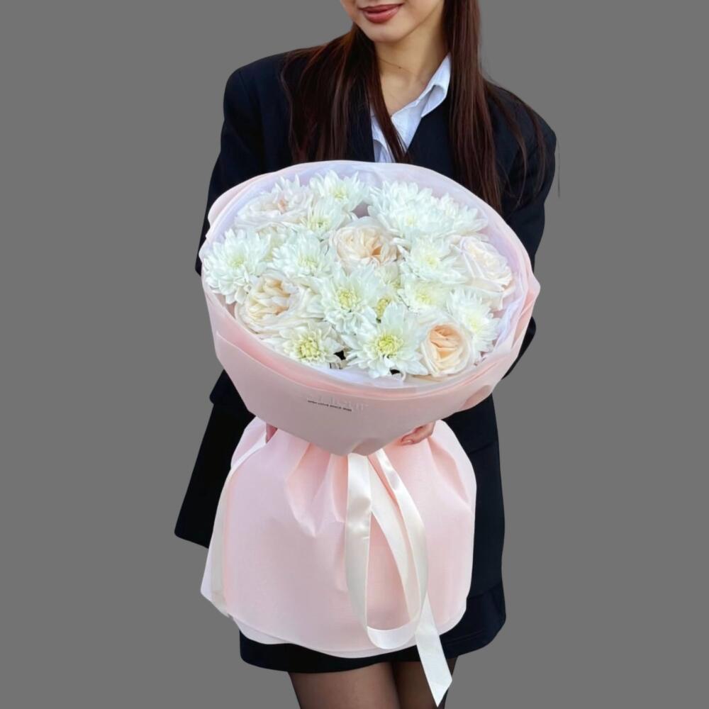 Состав: 3 кустовые хризантемы, 5 пионовидных роз, оформление. 💬 Солнечный и радостный букет, который заряжает настроением.