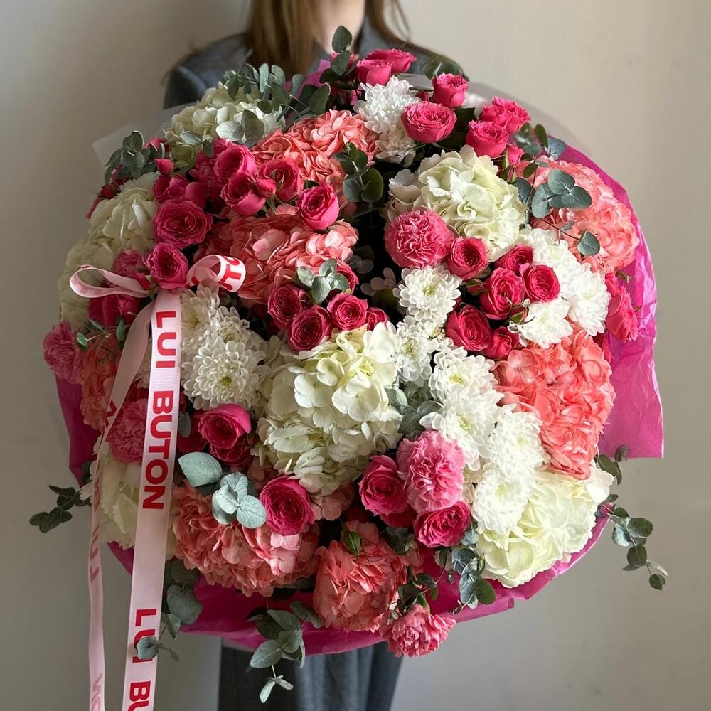 Гортензия - 13 дана Эвкалипт - 5 дана Диантус - 5 дана хризантемы - 7 дана бұта раушандары - 10 дана