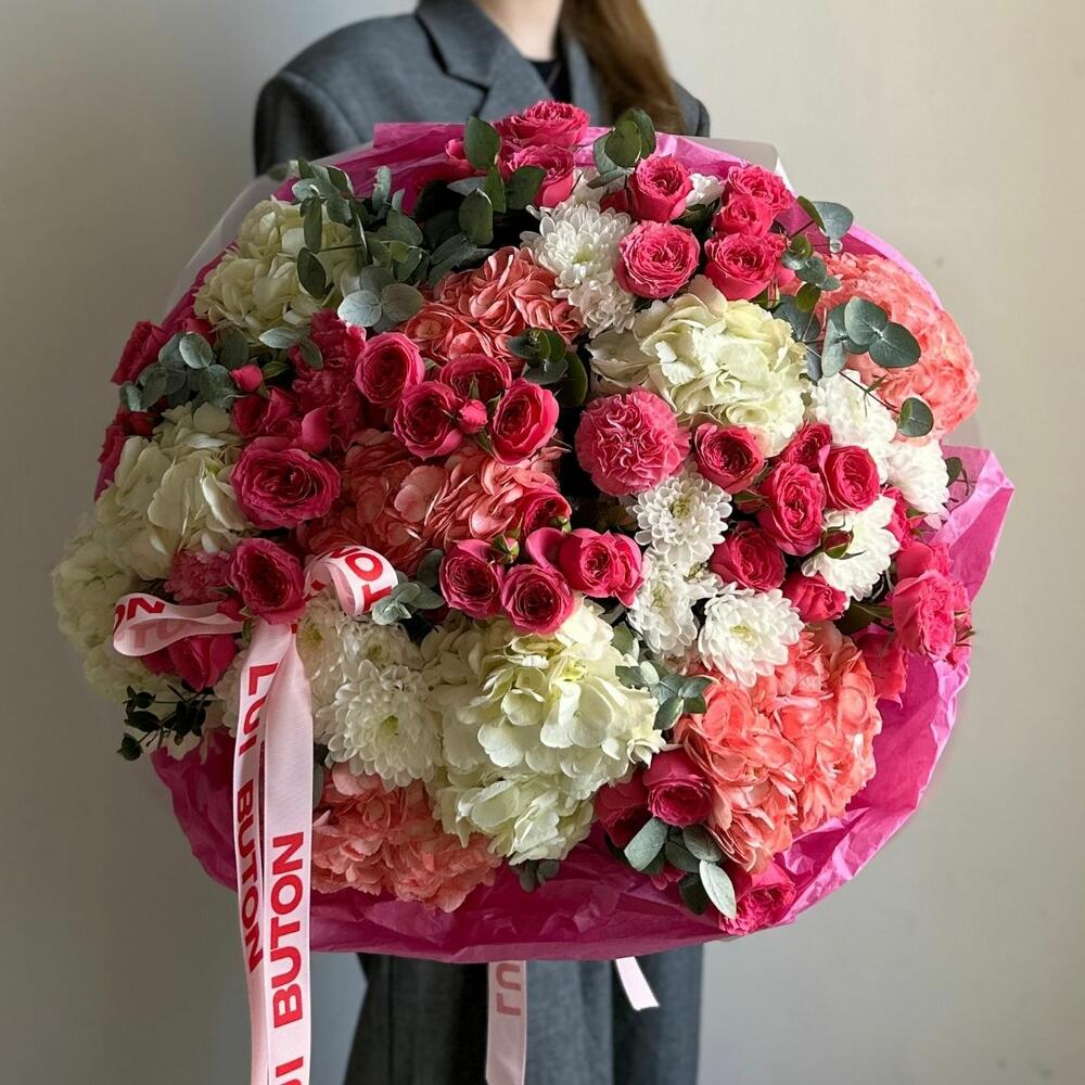 Гортензия - 10 дана Эвкалипт - 4 дана Диантус - 3 дана хризантемы - 5 дана бұта раушандары - 10 дана