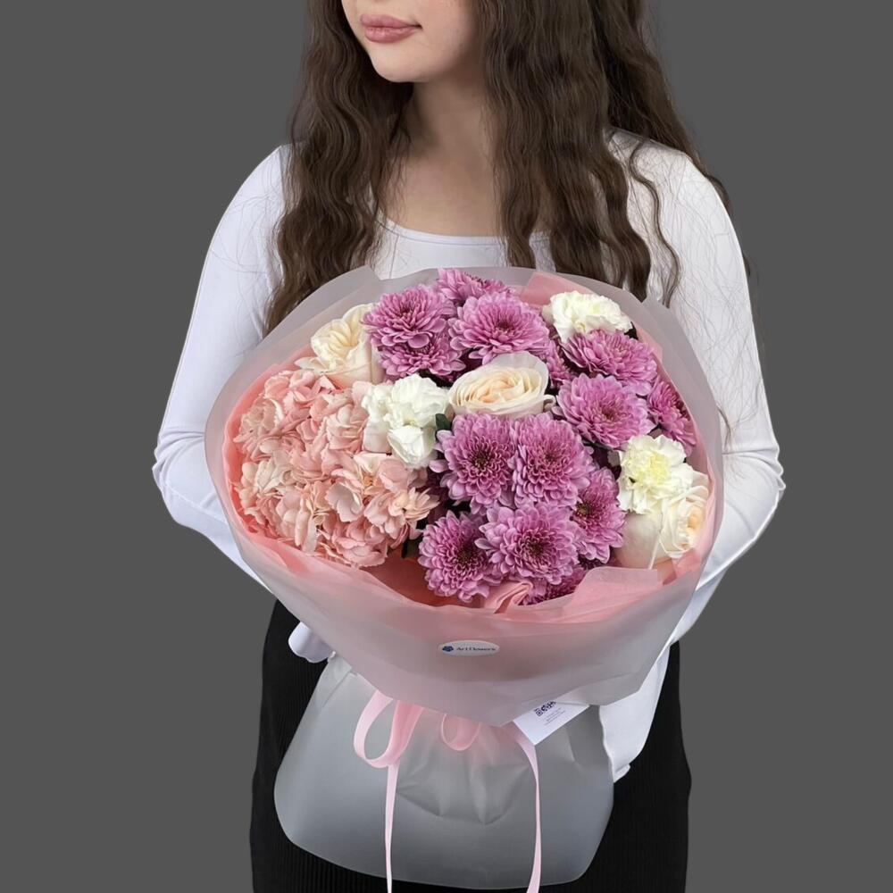 Гортензия - 1 дана Хризантема бұтасы - 3 дана Гвоздика - 3 дана Пионовидная роза - 3 дана