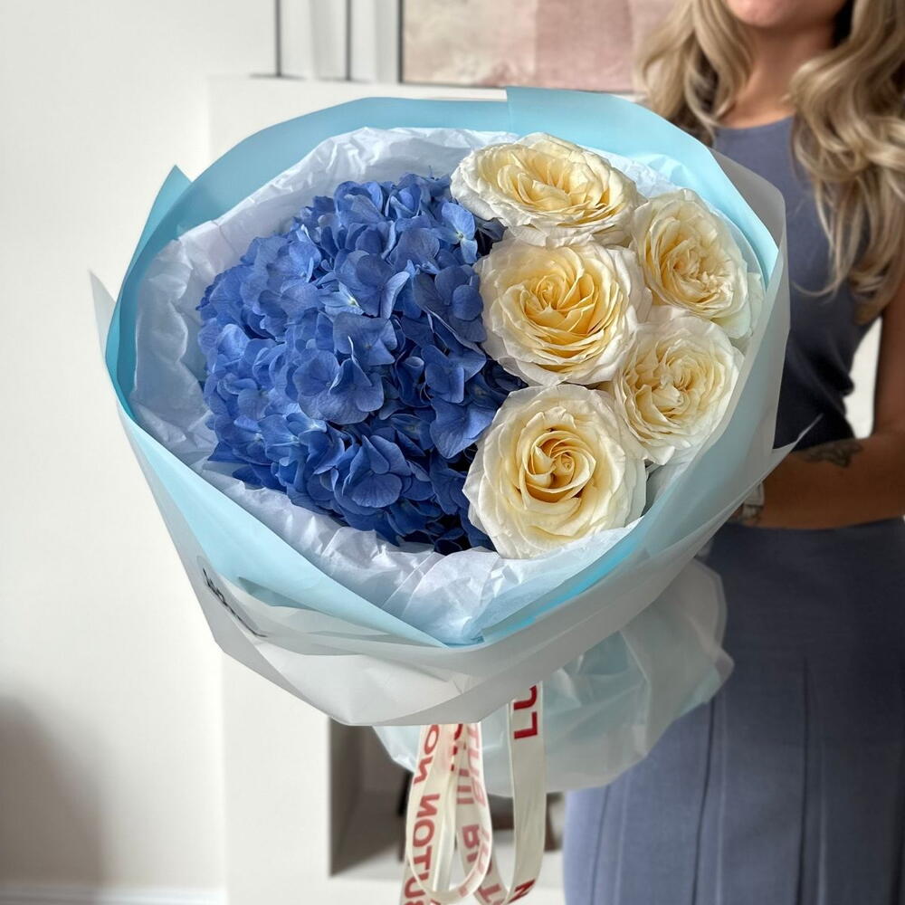 Яркий и жизнерадостный букет из гортензии и пионовидных роз создаст праздничное настроение. Такой подарок будет уместен в любой ситуации