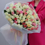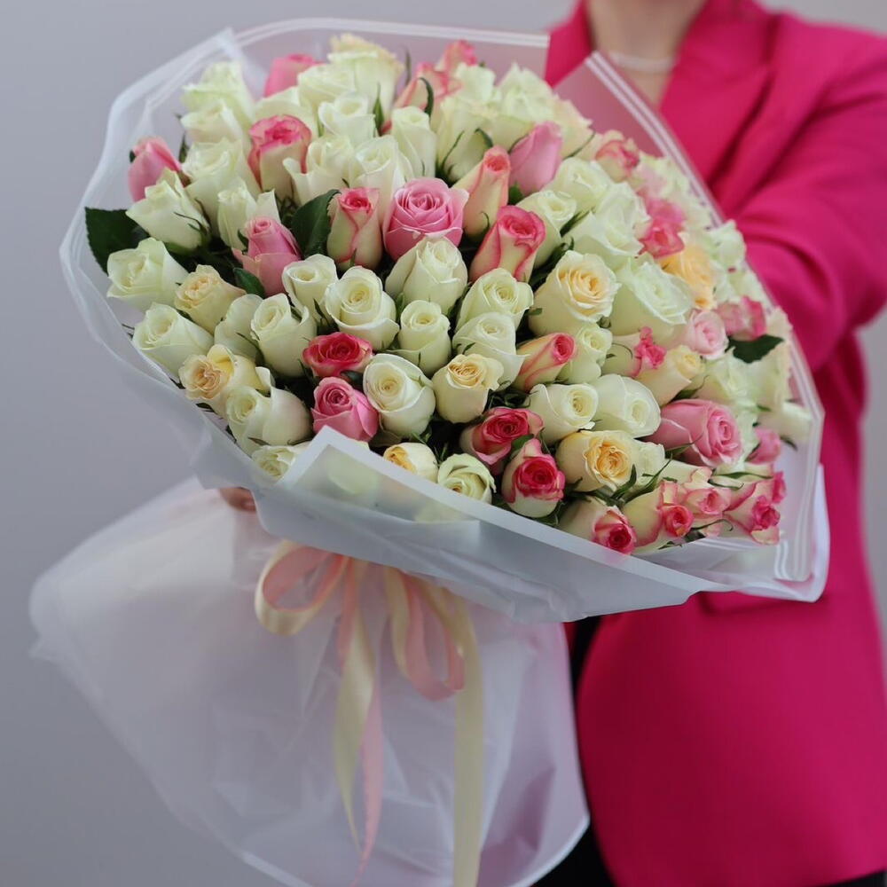 101 ақ раушан қызғылттары қосылған — ауқымды букет, онда тазалық нәзіктікпен тоғысады. Ақ раушандар негізін құрайды — жарық, салтанатты, ал қызғылттары жұмсақ акцент пен шынайы жылылық қосады. Композиция үйлесімді әрі сергек көрінеді, артық сәнқойлықсыз, бірақ айқын әсер қалдырады. Осындай букет сөз жеткізбегенде сыйланады. Ол бірден көп нәрсені айтады: құрмет, махаббат, алғыс. Ерекше күндерге, сезімдерін білдіруге және шын мәніндегі маңызды сәттерге жарайды. Жаңа гүлдерден жинап, жылдам әрі ұқыпты жеткізіледі — әрбір раушан сыйлау сәтіне дейін мінсіз күйінде қалады.