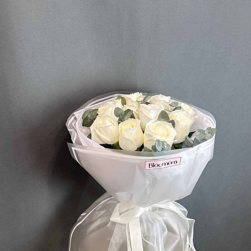 Эвкалипт - 8 дана ақ раушан - 13 дана
