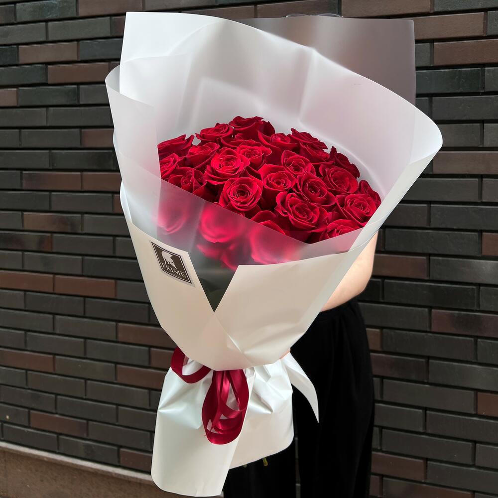Букет из 25 красных роз - Высота 50 - 60 см. - Фирменное оформление. - Фирменный шоколад в подарок!
