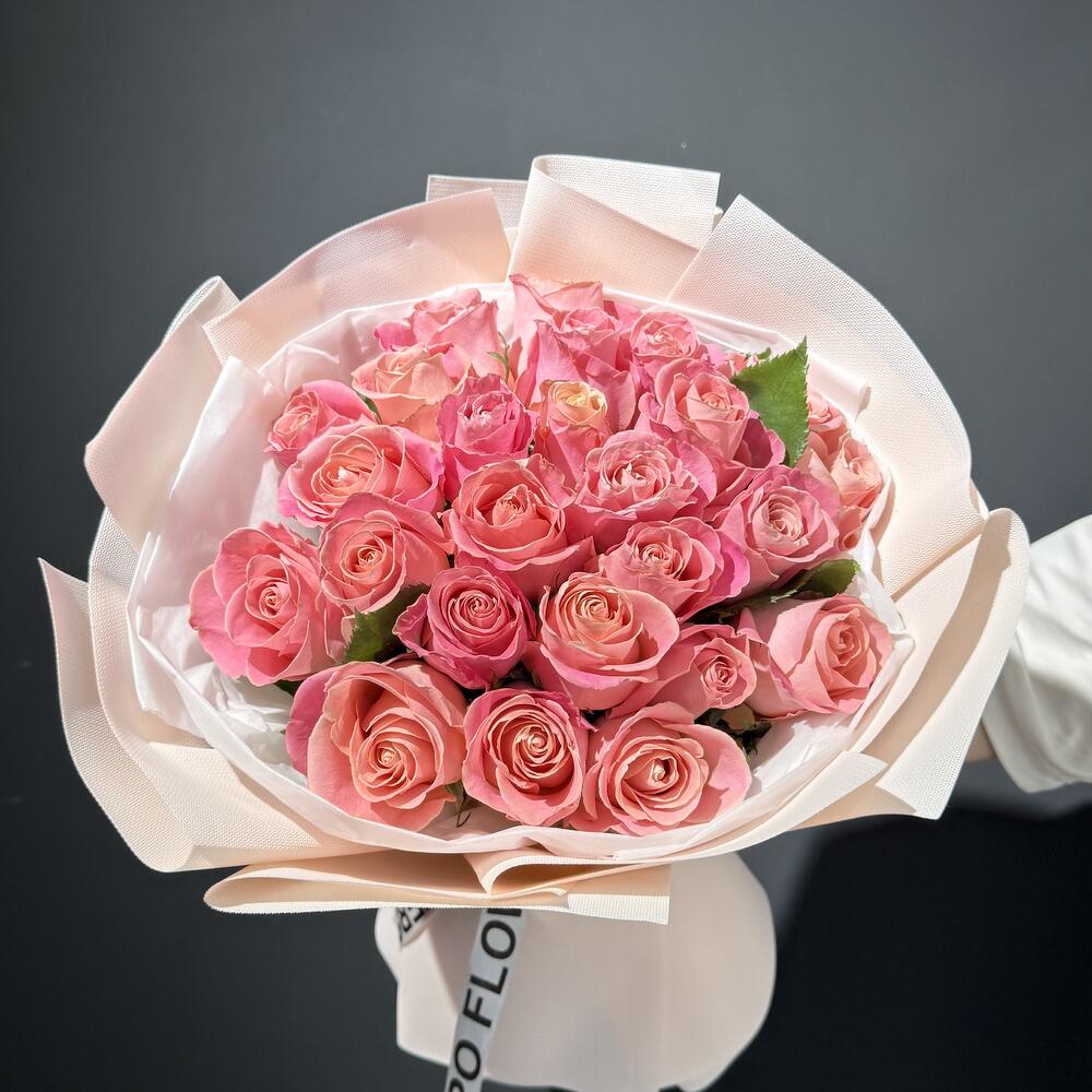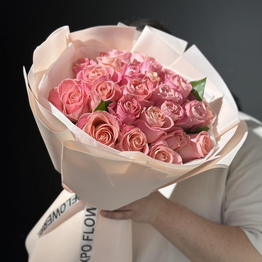 25 нежно-розовых роз — это воплощение трепета, нежности и утончённой романтики. Такой букет говорит о заботе, восхищении и светлых чувствах. Идеален для первых признаний, дней рождения и просто тёплого знака внимания.