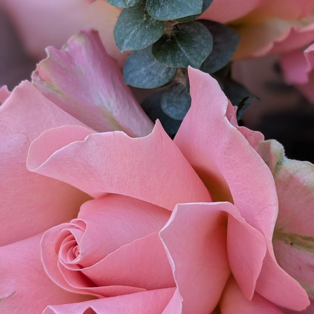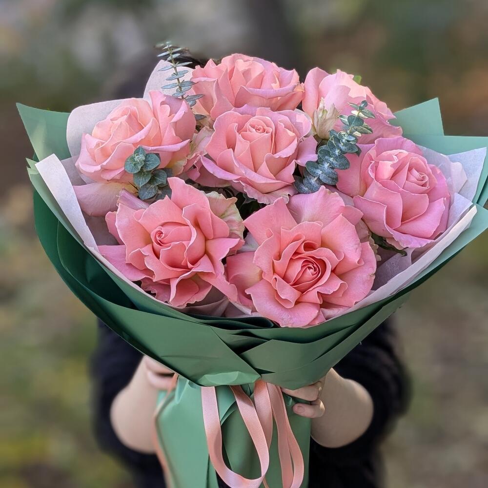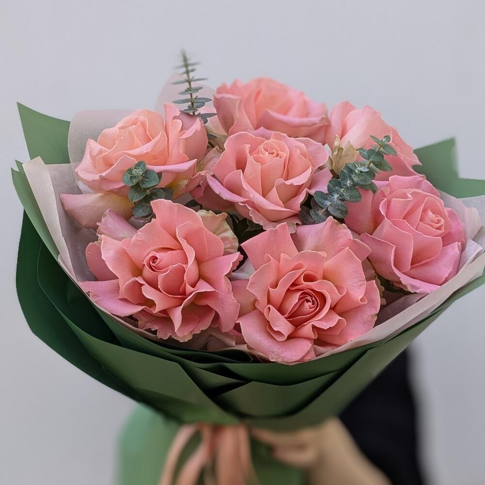 Эрмоза сорты 7 раушаннан тұратын букет эвкалиптпен