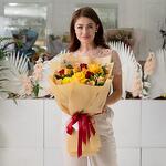 Гүл шоқысы "Лимонды бәліш" құрамы: бұтақты хризантема 2 дана, спрей-раушан 2 дана, аралас раушан 5 дана, альстромерия 2 дана, эвкалипт жапырағымен безендірілген 2 дана.