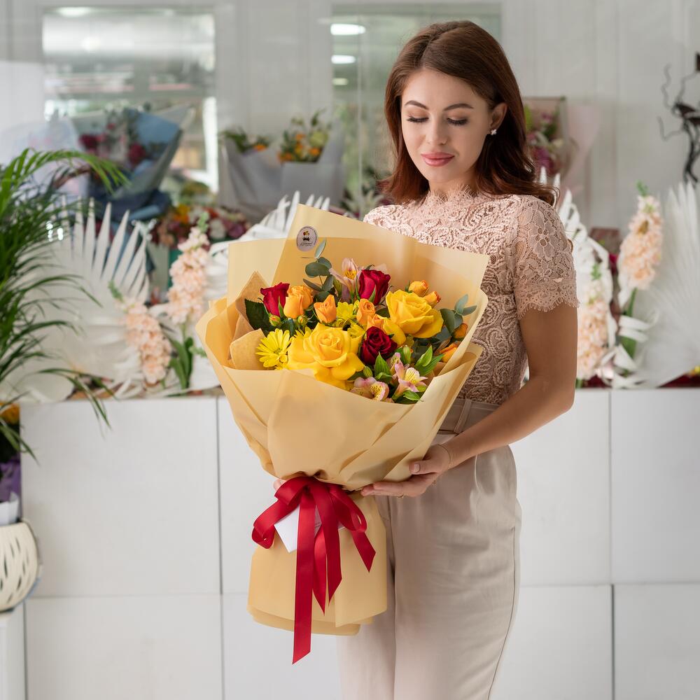 Гүл шоқысы "Лимонды бәліш" құрамы: бұтақты хризантема 2 дана, спрей-раушан 2 дана, аралас раушан 5 дана, альстромерия 2 дана, эвкалипт жапырағымен безендірілген 2 дана.