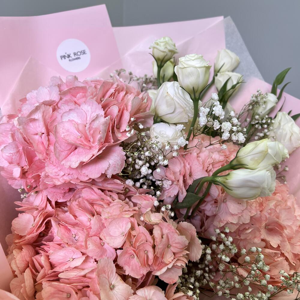 Это великолепное сочетание нежных оттенков и форм. Яркие гортензии добавляют шарма, а эустома вносит изысканность, создавая атмосферу изящества и романтики в вашем особенном моменте.