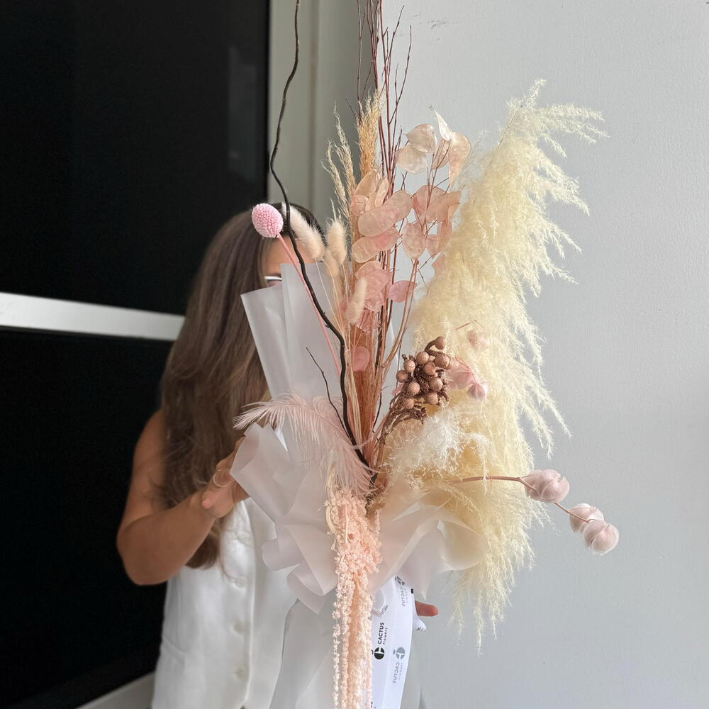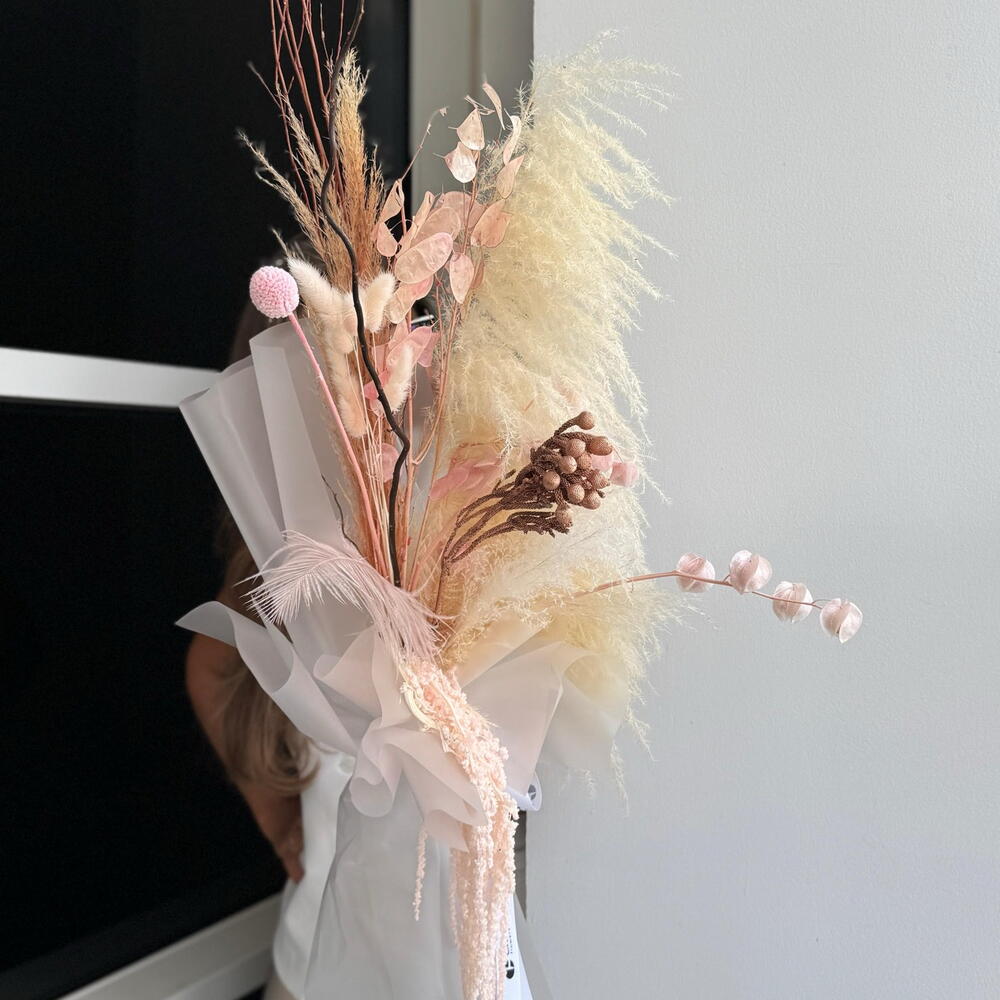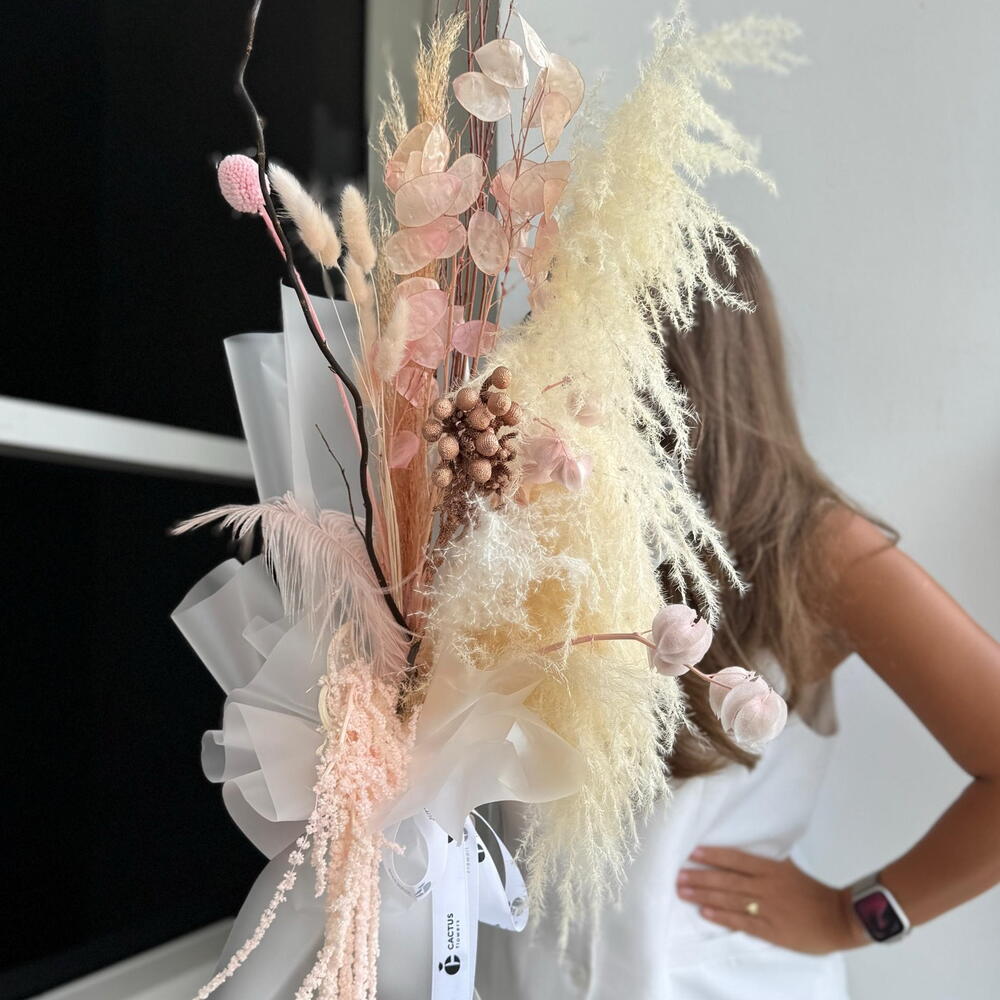 Краспедия - 1 дана Лагурус (кептірілген гүл) - 6 дана амарант стабилизированный - 1 дана лунария сухая - 1 дана пампас кортадерия - 1 дана бруния голд - 1 дана пампас сухоцвет - 1 дана