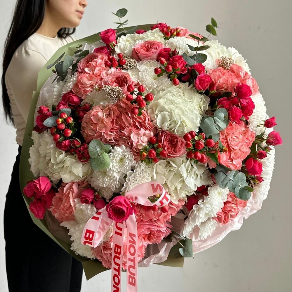 Гиперикум - 8 дана Эвкалипт - 4 дана хризантемы - 9 дана гортензии - 14 дана пионовидные розы - 5 дана бұта раушандары - 10 дана