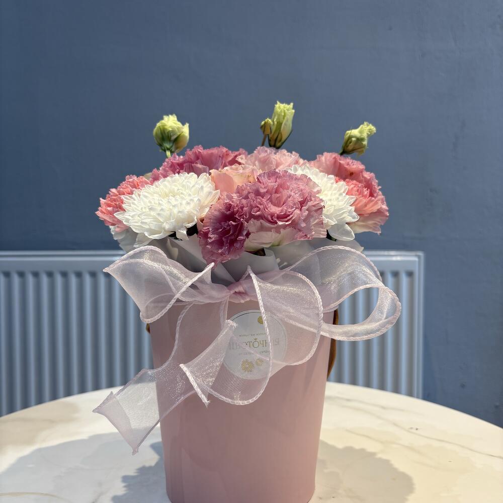 Маттиола - 1 дана Раушан - 2 дана Хризантема - 3 дана Гвоздика - 3 дана