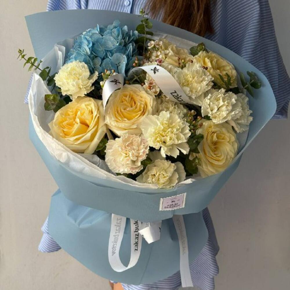 Ашықхат - 1 дана гортензия (колумбия) - 1 дана гвоздика (голландия) - 5 дана лимониум (голландия) - 1 дана роза голландская 60 см- - 5 дана