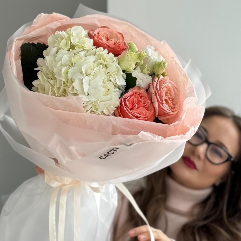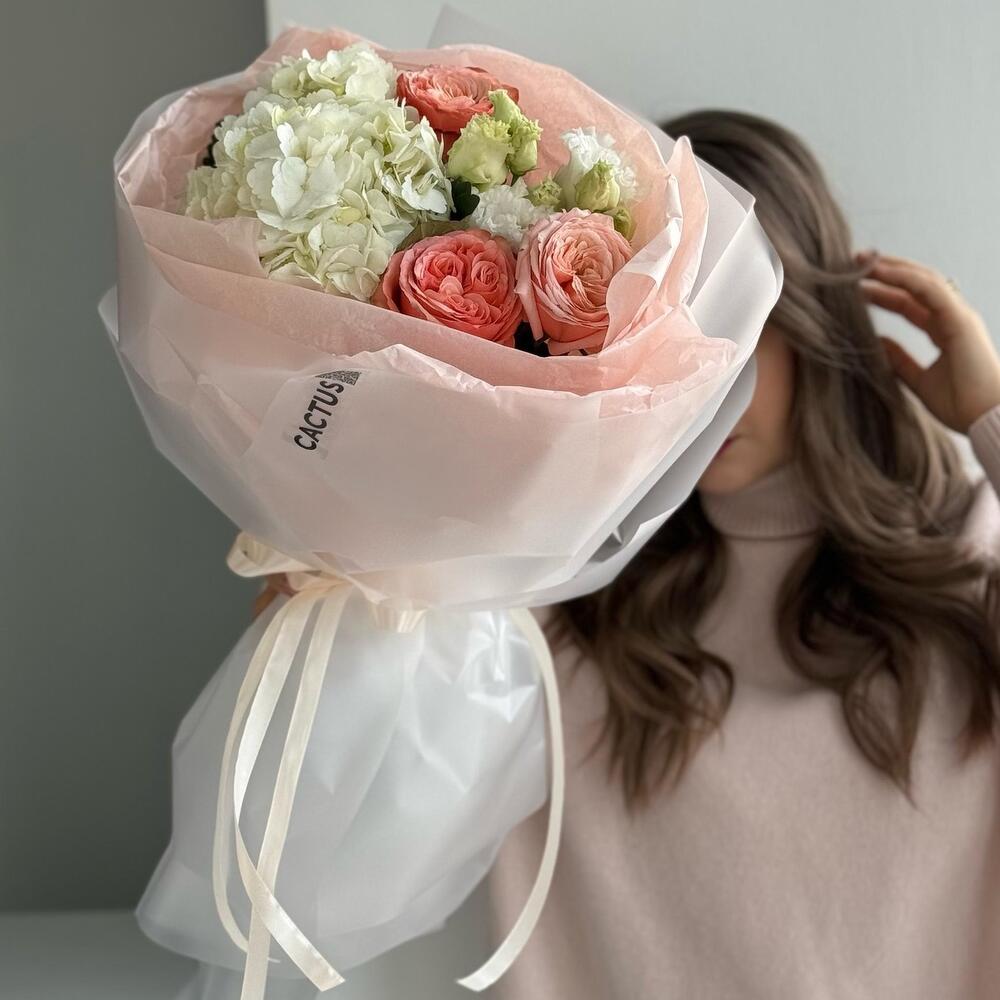 Гортензия - 1 дана Эустома - 1 дана Роза пионовидная - 3 дана Дизайнерлік қаптама - 1 дана