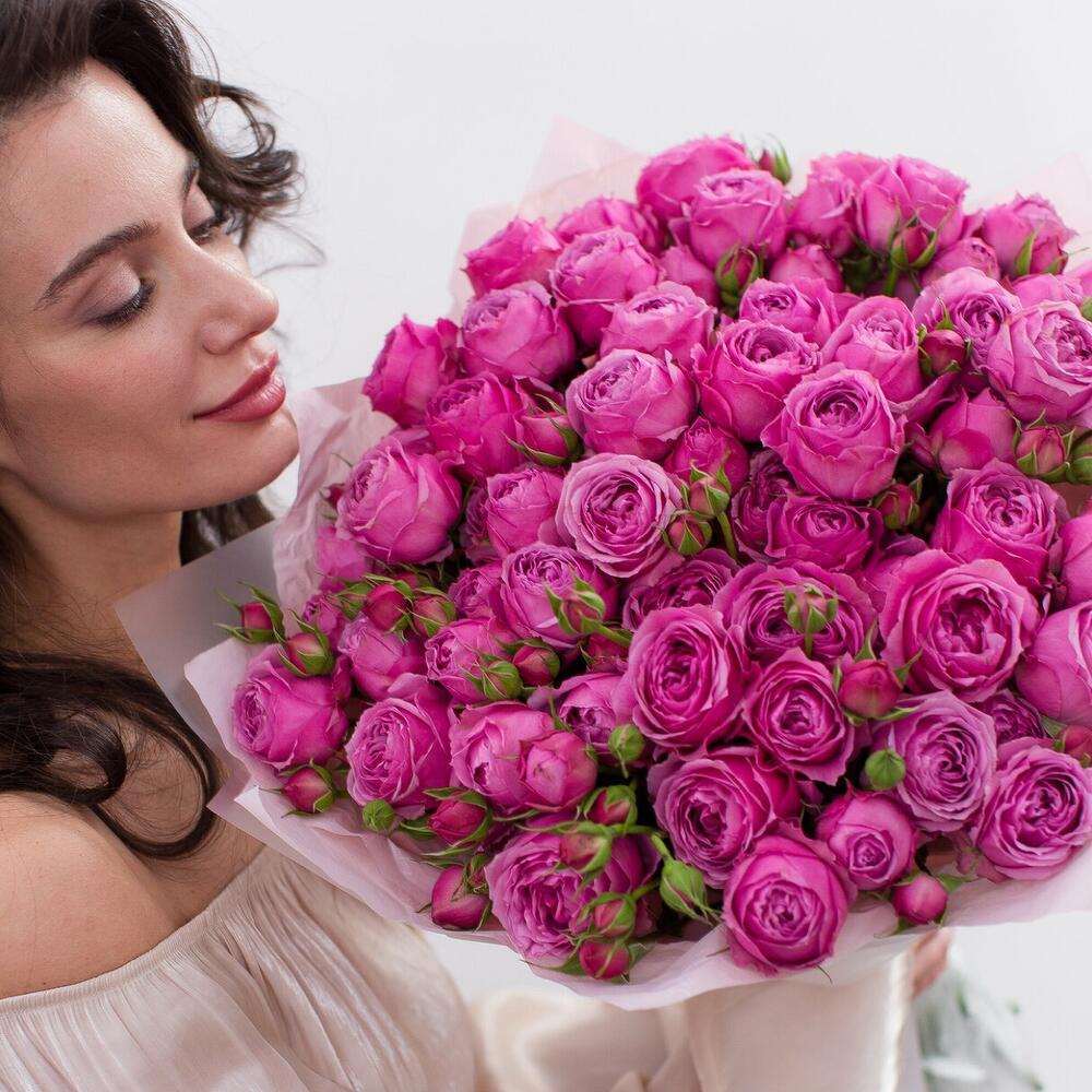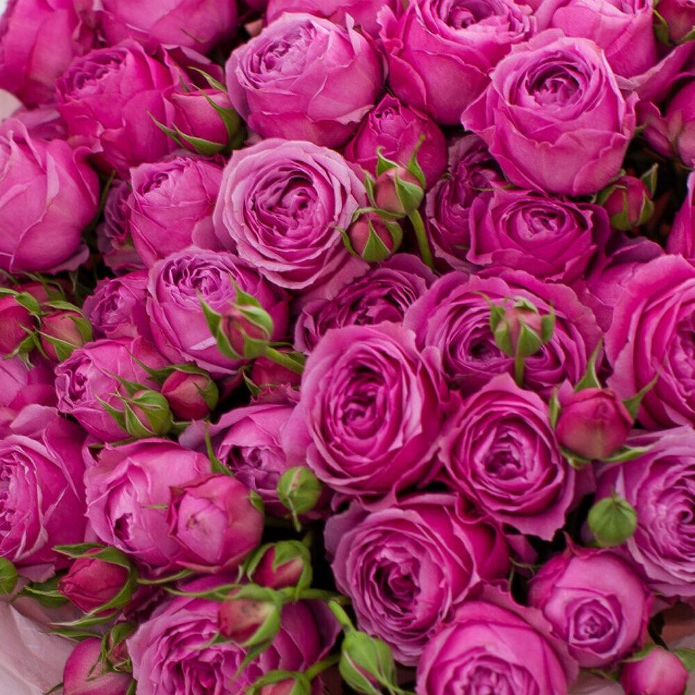 Букет из ярких кустовых роз фуксиевого цвета, сочетающий пышные соцветия и нежные бутоны. Прекрасный выбор для создания элегантного и радостного настроения💐