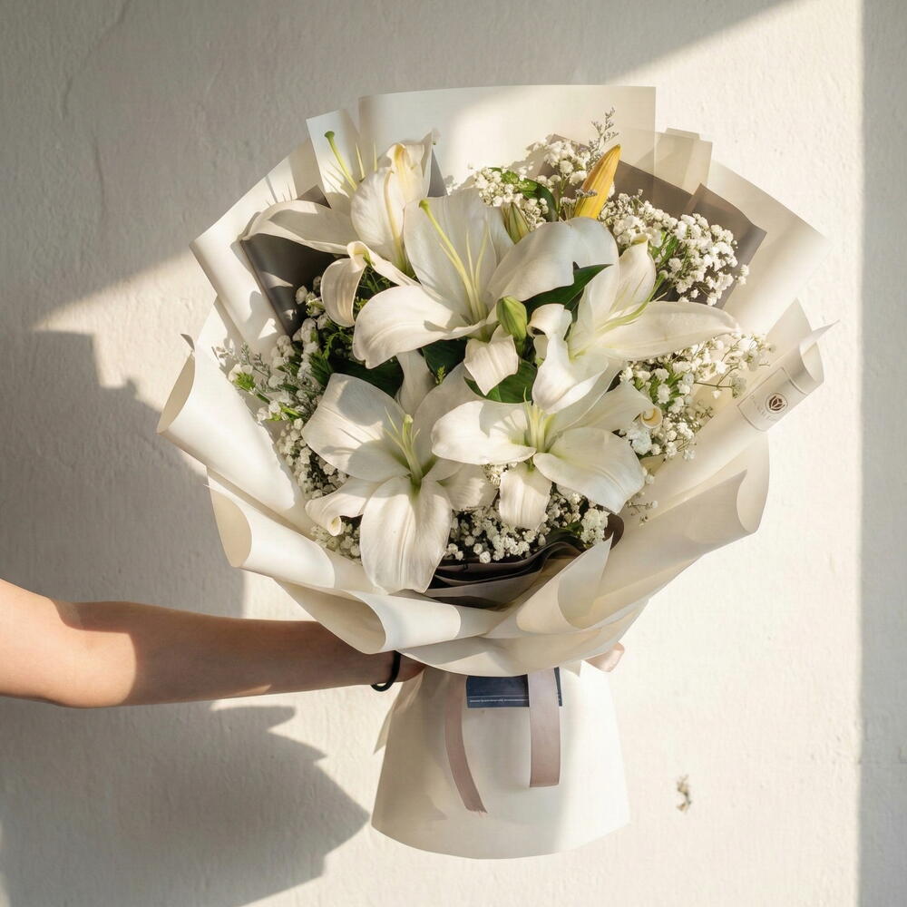 Этот изысканный монобукет воплощает искусство и элегантность. Он состоит из пяти роскошных белых лилий, которые благородно сочетаются с тремя ветвями легкой и нежной гипсофилы. Белый цвет этих цветов символизирует чистоту, нежность и независимость, делая этот букет идеальным подарком для выражения своих искренних эмоций. Этот букет радует своим великолепием и способен оживить любое пространство.