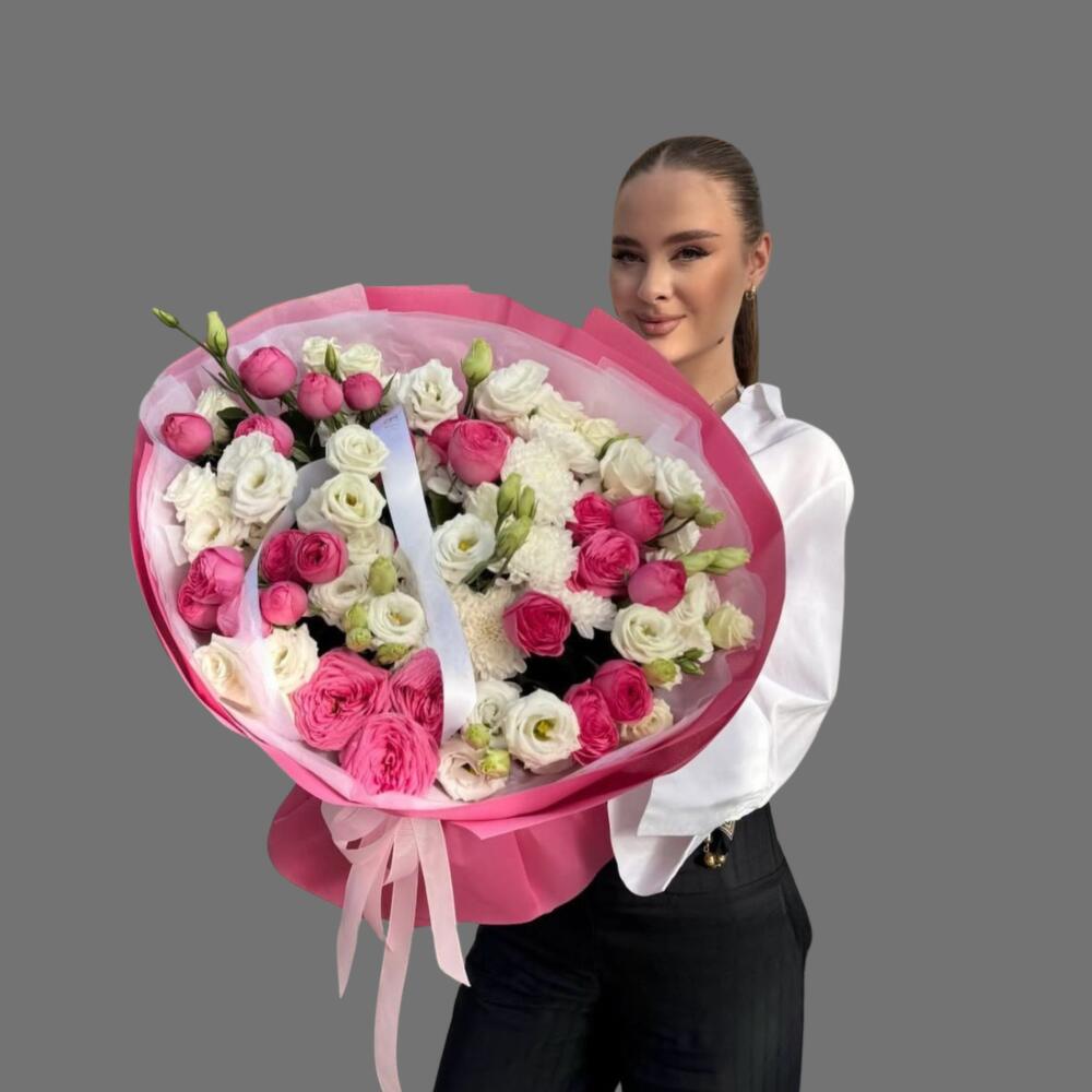 Хризантема бұтасы - 1 дана Бұта раушаны - 6 дана лизиантусов - 11 дана аква бумага - 1 дана