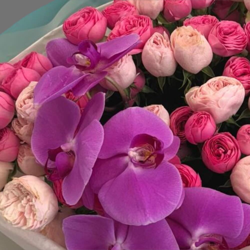 Кустовая пионовидная роза - 17 дана ЦИМБИДИУМ - 6 дана аква бумага - 1 дана