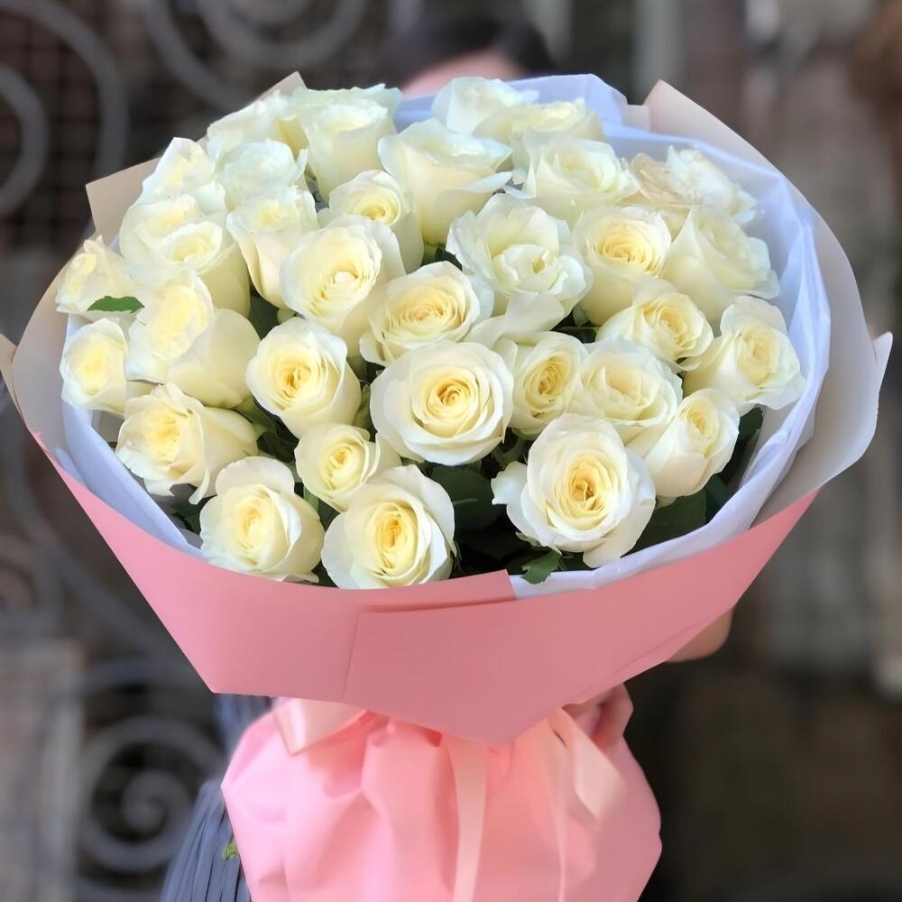 Изысканный букет из белоснежных роз с кремовым оттенком — воплощение элегантности и утончённости. Оформленный в стильную упаковку с мягкими розовыми тонами, он выглядит по-настоящему воздушно и гармонично. Такой букет станет прекрасным подарком для любого случая, будь то день рождения, юбилей или просто знак внимания для дорогого человека. Белые розы символизируют искренность, теплоту и чистоту чувств.