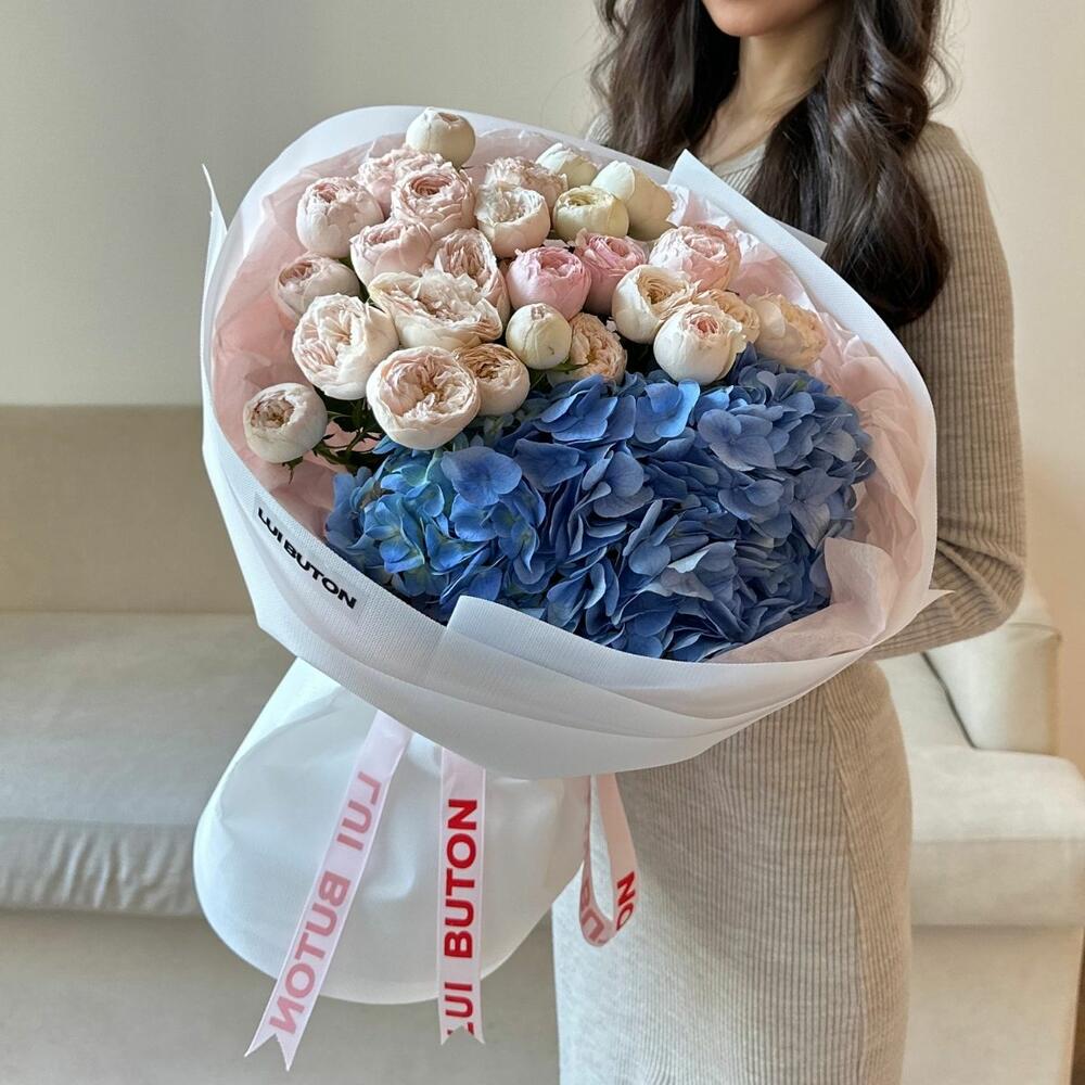 В данном букете из гортензии и кустовых роз собраны нежность, внимание и забота