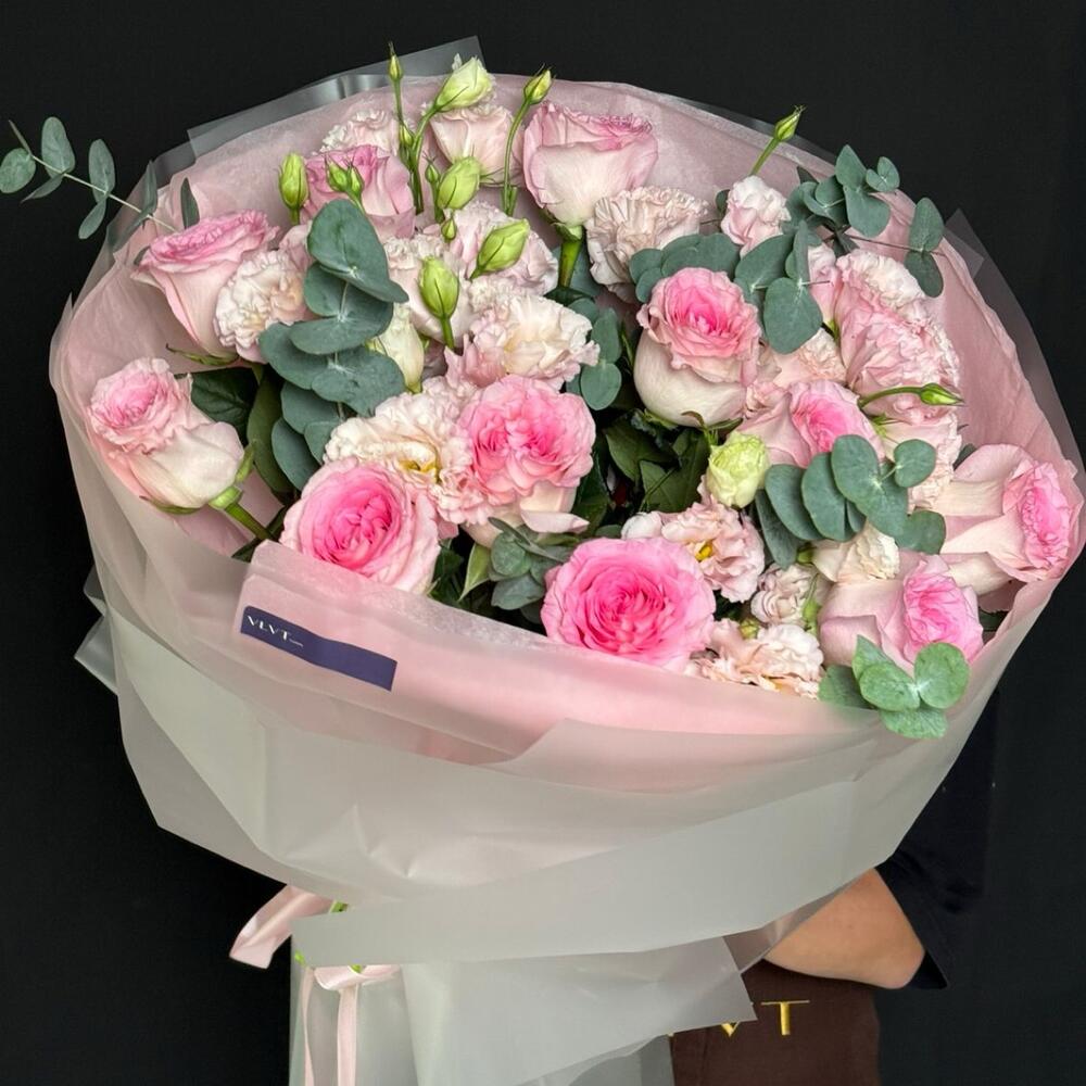 Нежный букет в розовой палитре из роз сорта мандала и розового лизиантуса с добавлением ароматного эвкалипта. Лёгкая и утончённая композиция, которая символизирует чистоту, гармонию и спокойствие. Идеальный вариант для поздравления с Днём рождения, юбилеем, свадьбой или просто чтобы подарить радость близкому человеку.