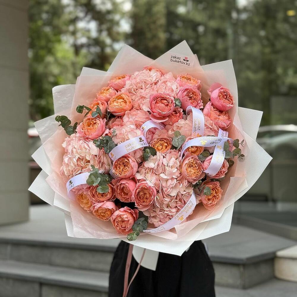 Ашықхат - 1 дана гортензия (колумбия) - 5 дана эвкалипт (голландия) - 1 дана спрей роза (кения) - 6 дана