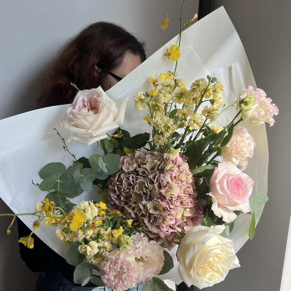 Маттиола - 2 дана Раушан - 3 дана гвоздики - 2 дана онцидиум - 2 дана голландские гортензии - 1 дана