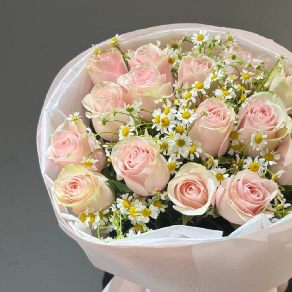 🌹 15 классических роз и 5 нежных ромашек — утончённый букет с тёплой подачей. Оформлен с любовью и вниманием к деталям, отлично подойдёт для любого повода.