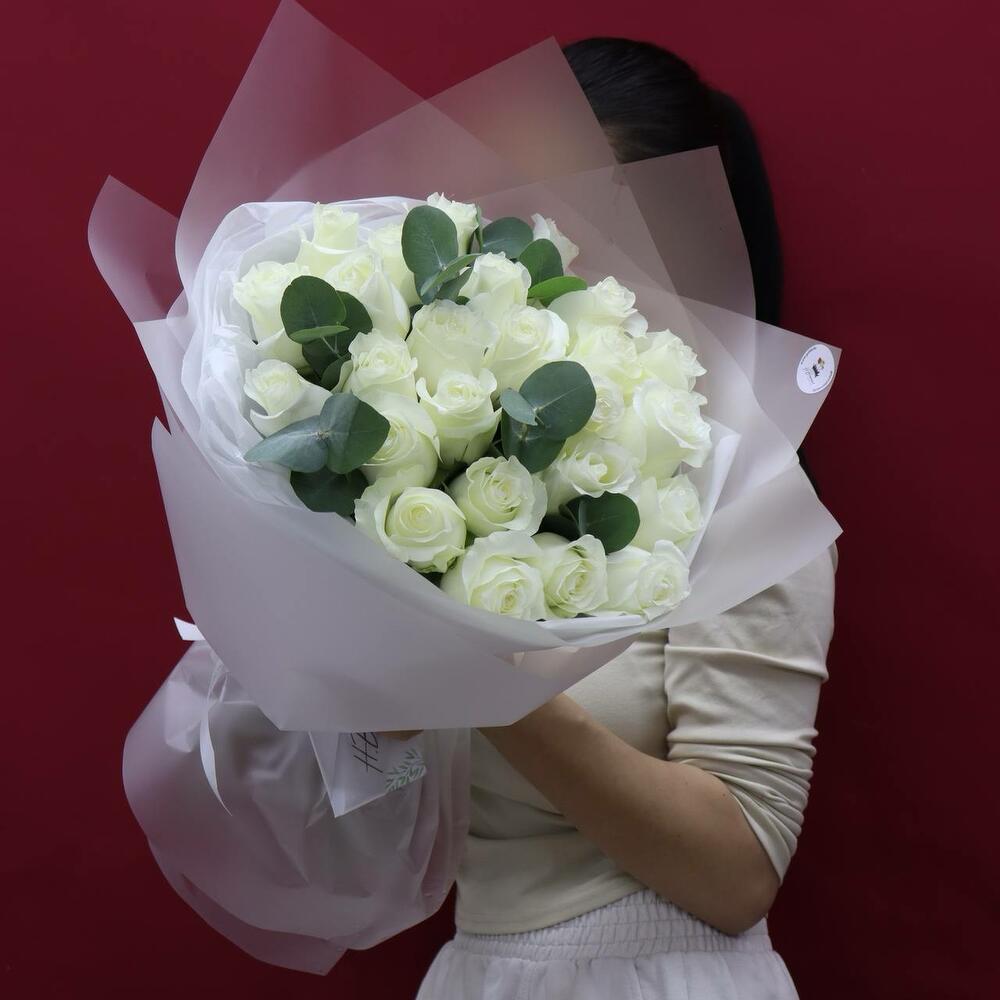 Утонченный букет из белых роз и эвкалипта Состав: Роза 25 Эвкалипт 1 оформление