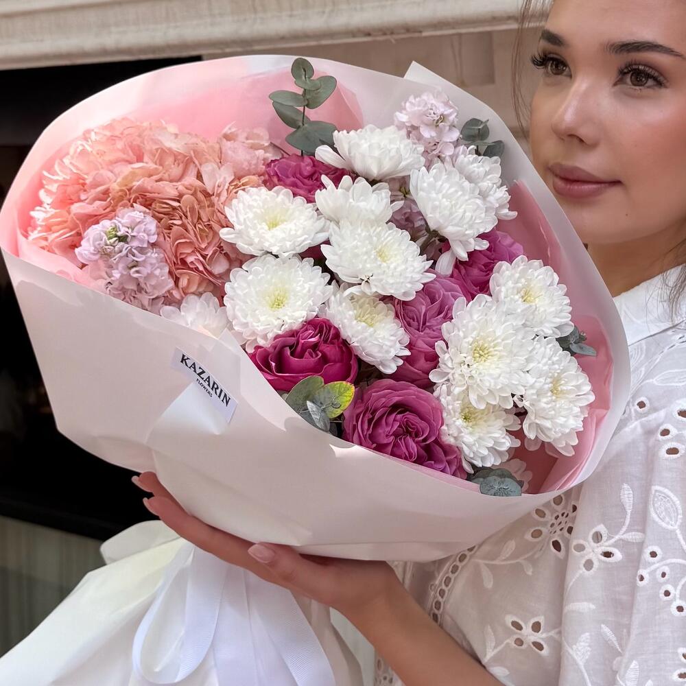 Гортензия - 1 дана Маттиола - 2 дана Эвкалипт - 1 дана Раушан - 5 дана хризантемы кустовые - 3 дана
