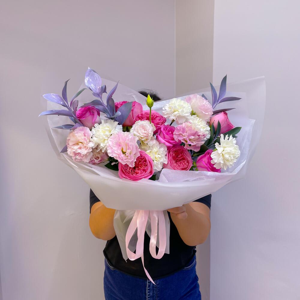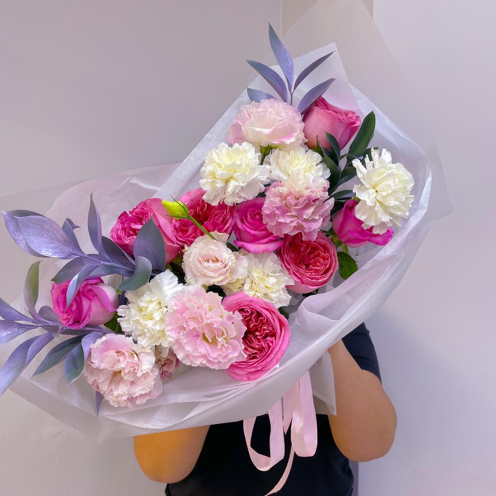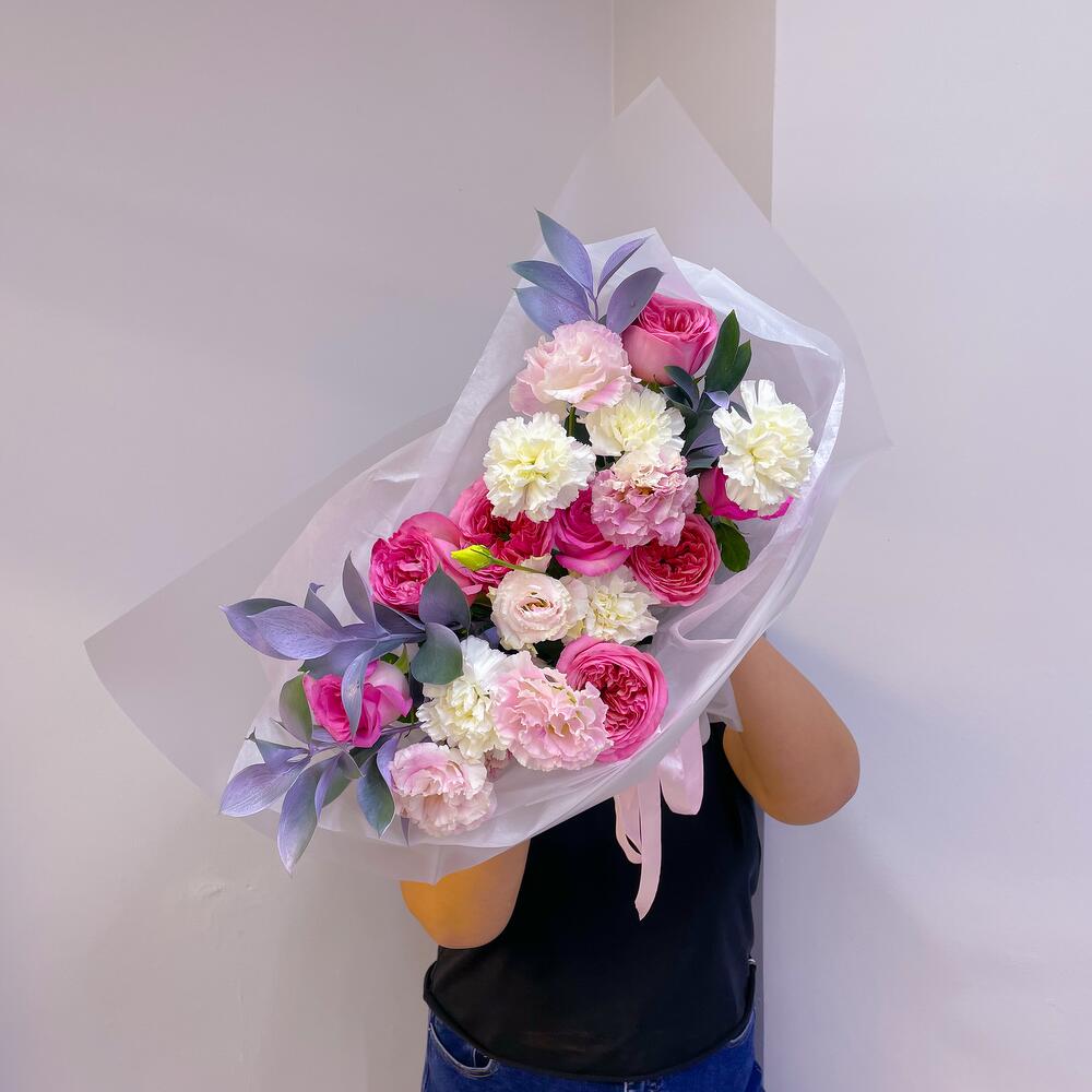 Рускус - 4 дана Эустома - 3 дана голландские розы - 3 дана пионовидные розы - 5 дана диантусы - 5 дана