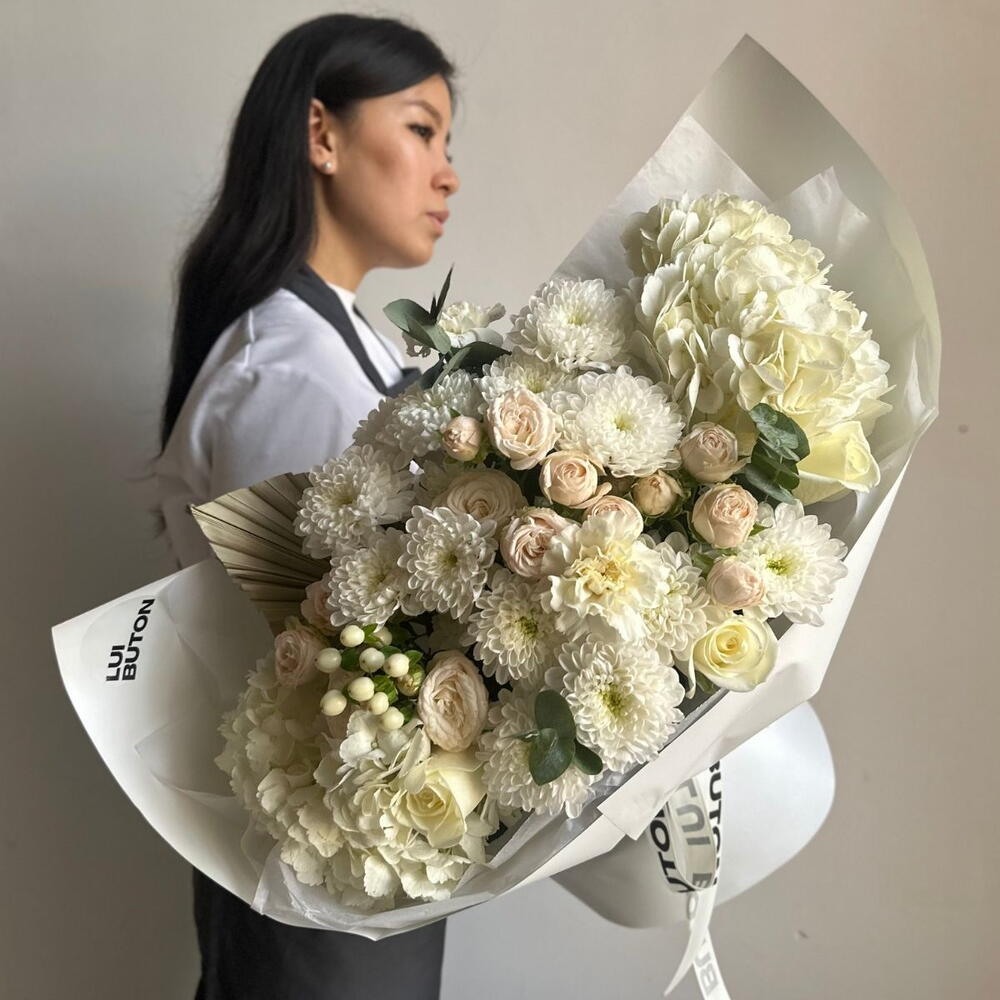Гиперикум - 1 дана Гортензия - 2 дана Эвкалипт - 1 дана хризантемы - 5 дана раушан - 3 дана бұта раушандары - 4 дана пальмовый лист - 1 дана