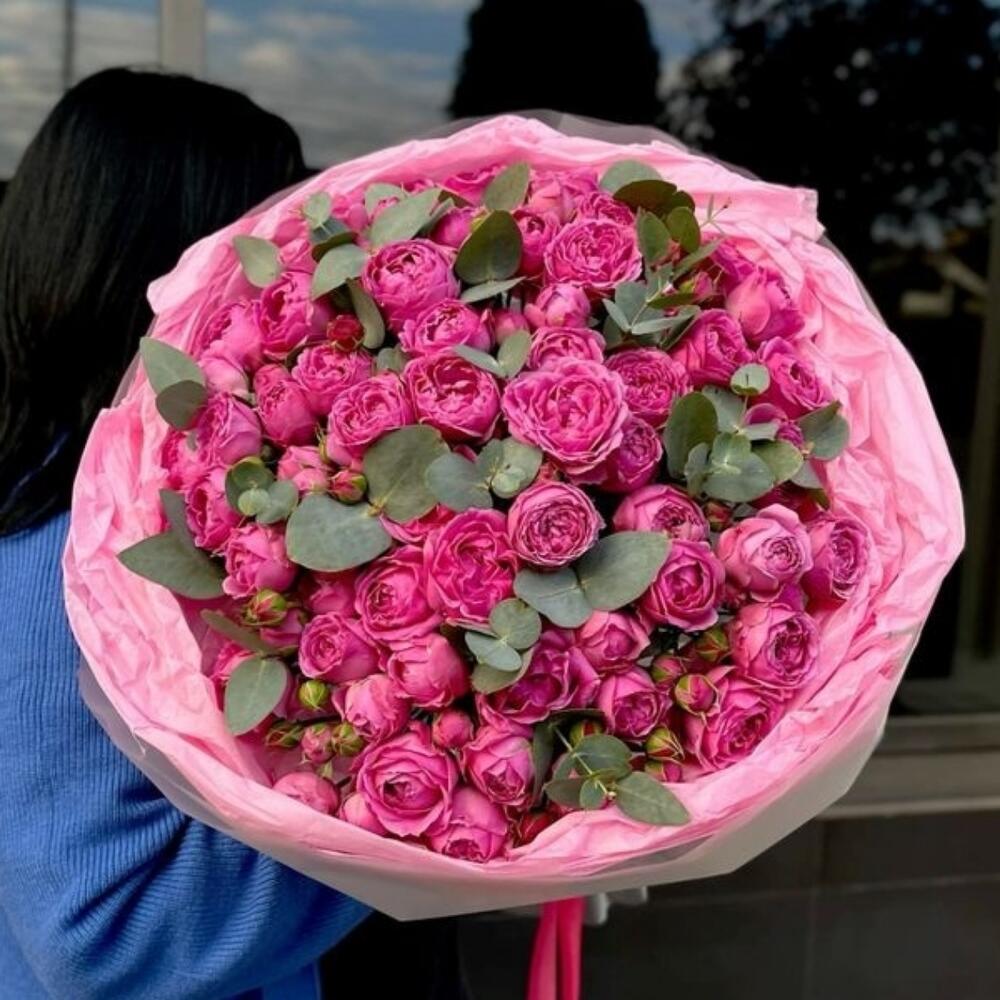 Яркие пионовидные розы в сочетании со свежей эвкалиптовой зеленью создают поистине роскошную композицию. Стильная упаковка в розовых тонах подчеркивает сочность оттенков и добавляет букету особое очарование. Такой подарок идеально подойдет для самых торжественных случаев или как символ ярких чувств и искренних эмоций.