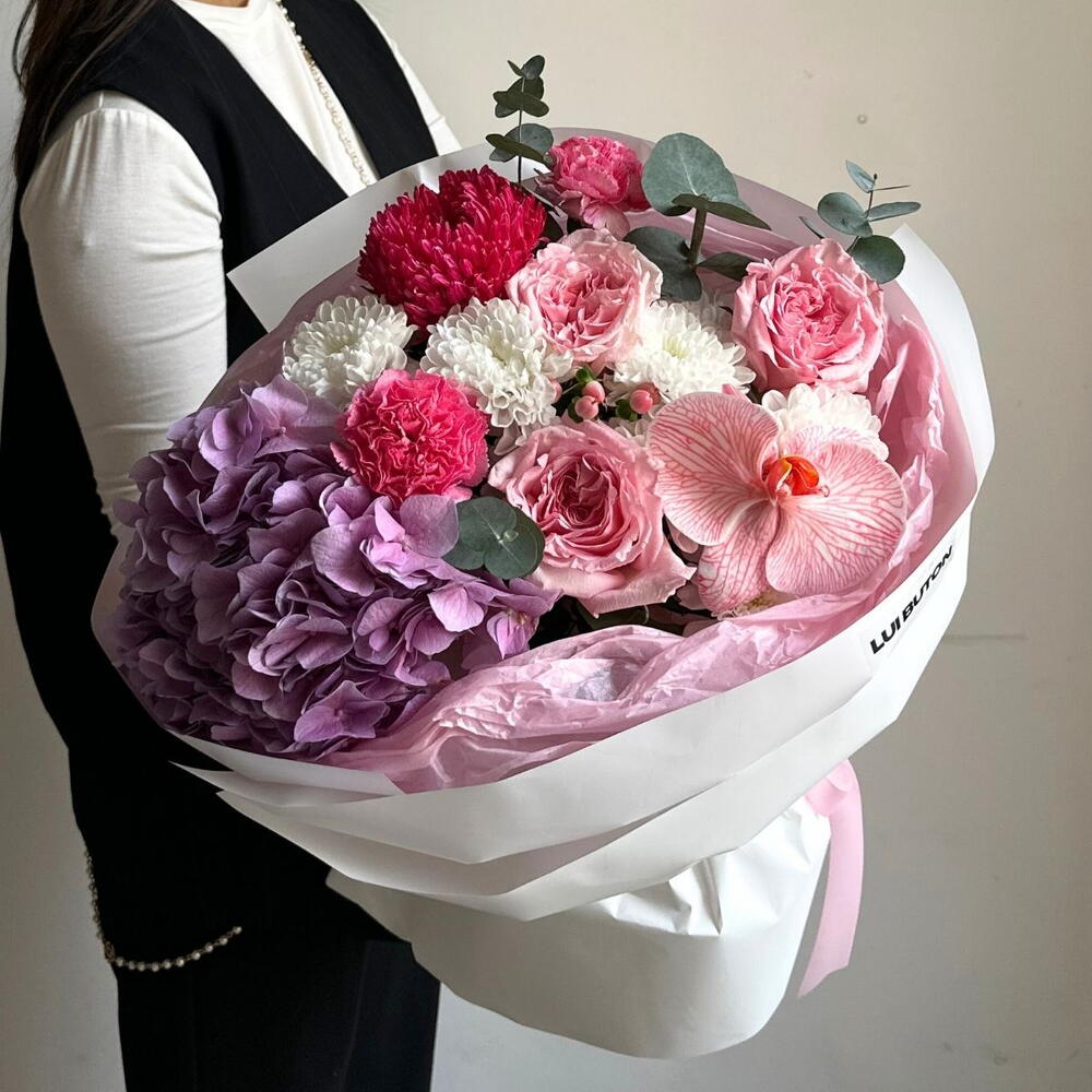 Гиперикум - 1 дана Гортензия - 1 дана Эвкалипт - 1 дана Хризантема - 1 дана Диантус - 2 дана орхидея - 1 дана Одноголовая хризантема - 1 дана пионовидные розы - 3 дана