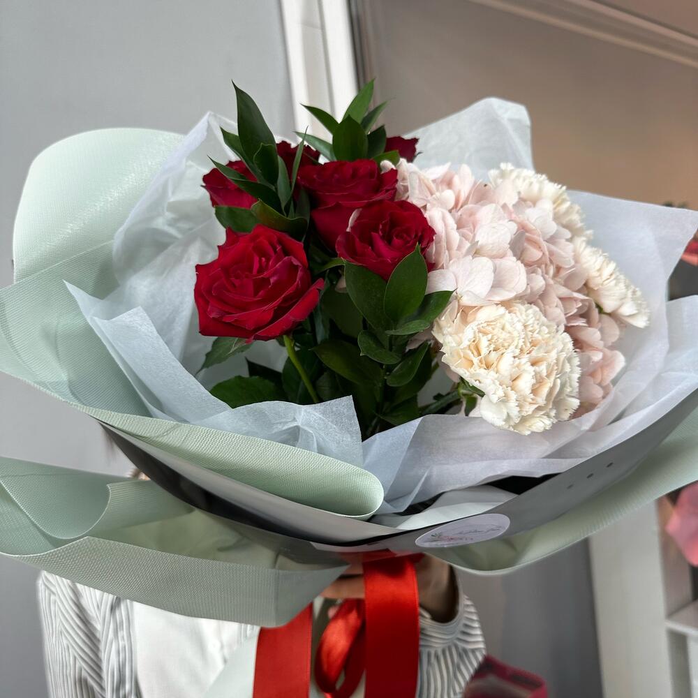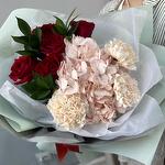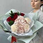 Роза красная - 5 дана Гвоздика - 3 дана Қызғылт Гортензия - 1 дана