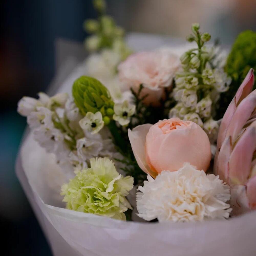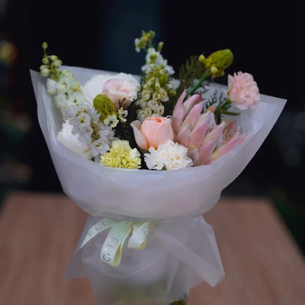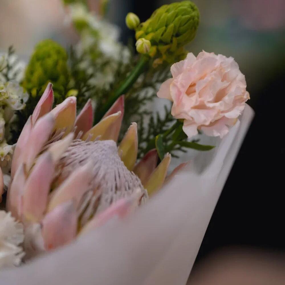 Маттиола - 3 дана Протея - 1 дана Эустома - 1 дана Диантус - 2 дана Орнитогалум - 3 дана Дизайнерлік қаптама - 1 дана Аквабокс - 1 дана Туя - 1 дана Хризантема магнум - 2 дана открытка на выбор - 1 дана роза джульетта одноголовая - 1 дана витамины для цветов - 1 дана