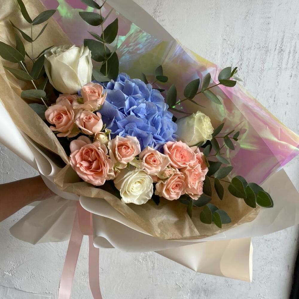 Гортензия - 1 дана раушан - 3 дана бұта раушандары - 3 дана